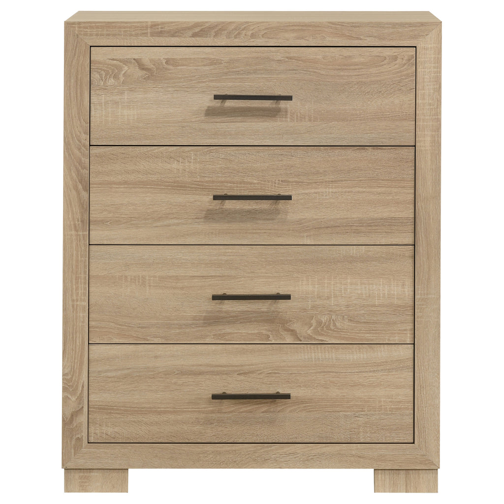 A graceful blend of form and function, this four-drawer chest brings refined charm to any bedroom. Its clean silhouette is softened by a warm light oak finish, while antique nickel hardware adds a touch of elegance. Thoughtfully crafted from engineered wood with a durable laminate veneer, it balances beauty with resilience. Smooth-gliding drawers feature English dovetail joinery, offering a timeless solution for storing clothing and daily essentials. Key Features: • Four-drawer chest with clean lines and a light oak finish for soft contemporary styling • Antique nickel hardware adds contrast and shine to the light oak wood tone • English dovetail joinery reinforces drawer durability and structure • All four drawers glide smoothly on 35mm full-extension metal glides • Crafted from engineered wood with a scratch-resistant laminate veneer exterior • Compact rectangular profile offers practical storage for bedroom or closet spaces