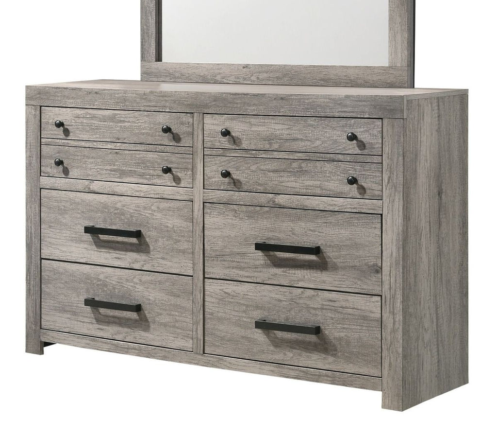 Crown Mark Tundra Dresser in Grey B5520-1. This Tundra dresser from Crown Mark combines style and utility. It comes in a light brown finish and features 6 drawers with black metal hand pull. This piece is great for your folded T-shirts, sweaters, or extra linens.