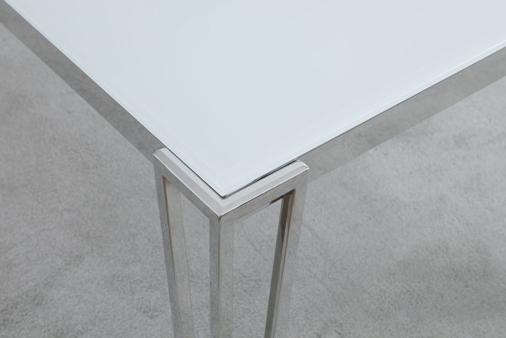 Clean lines and sleek materials give this dining table a distinctly modern edge. The white frosted tempered glass top offers a bright, airy look, while the polished stainless steel frame delivers durability and shine. Designed with geometric, hairpin-inspired legs, this rectangular dining table comfortably seats six and suits both casual and formal dining spaces with effortless style. Key Features: • Modern dining table features a sleek, contemporary silhouette • White frosted tempered glass top creates a clean, sophisticated surface • Polished stainless steel frame adds lasting strength and visual appeal • Hairpin-style legs with exposed corner brackets for a modern twist • Crafted from heavy-gauge metal and 12mm thick glass for long-term durability • Versatile size comfortably seats up to six for everyday or formal meals