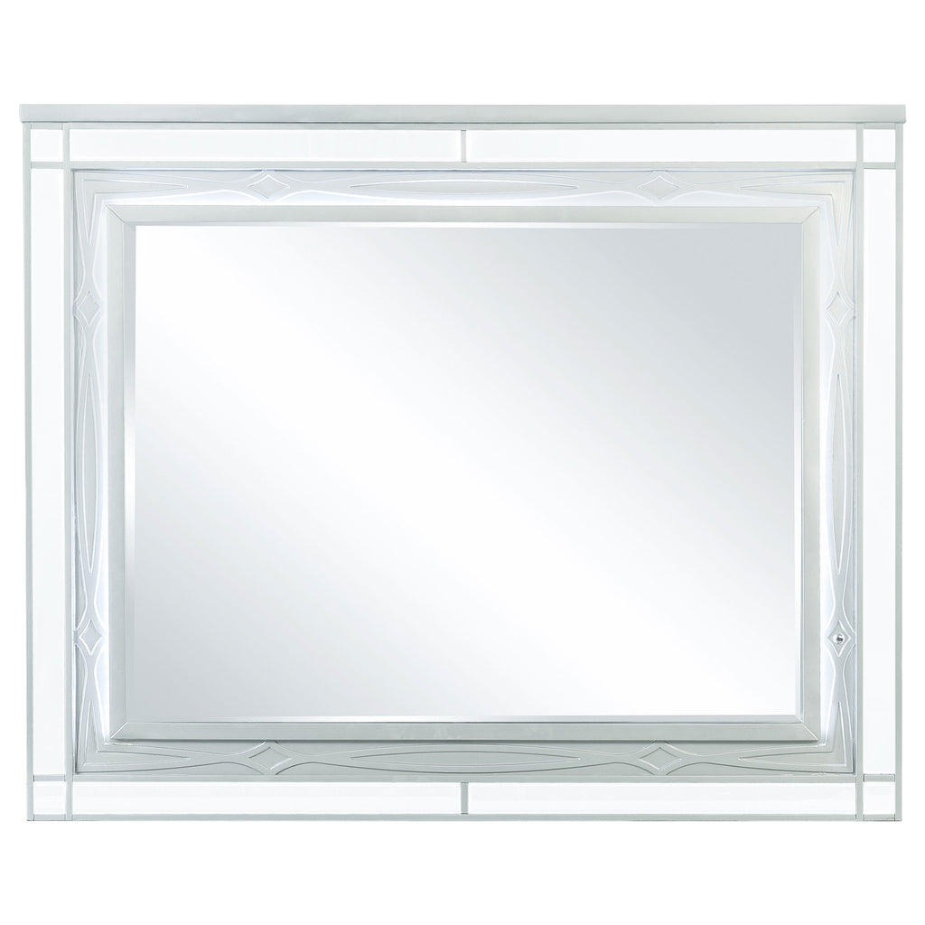 This contemporary 4-piece bedroom set featuring a bed, nightstand, dresser, and mirror imparts a glamorous look and feel to any modern home. Each piece of this exclusive Coaster design comes in a shimmering silver metallic finish that enlivens any space. The imposing bed headboard is upholstered with metallic leatherette that's fully tufted with crystal buttons. The headboard and mirror include white LED touch lighting for a vibrant ambiance, while the nightstand features USB ports. The drawers on each case good are crafted with fret work detail on the front panels and crystal-like pulls, with top drawers lined with black felt to protect your valuables. Key Features: • Bedroom set includes matching platform bed and mirrored storage pieces • Silver metallic finish pairs with mirrored trim and crystal hardware throughout • Headboard features LED lighting and tufted metallic leatherette upholstery • Drawer fronts include raised fretwork with felt-lined top drawers • Nightstand includes built-in USB ports for charging convenience • Engineered wood and polyresin construction offers style and lasting durability