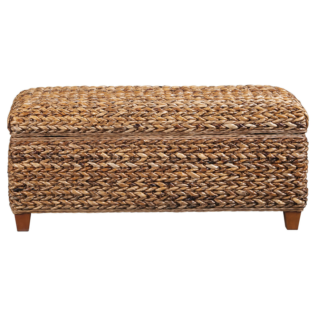 Bring warmth and functionality into your home with this hand-woven storage bench, crafted from natural banana leaf over a sturdy solid wood frame. Finished in rich amber tones, it blends rustic charm with modern country appeal. The woven texture adds organic detail, while the hinged lid lifts to reveal a spacious interior for blankets, pillows, or daily essentials. Elevated on tapered honey-finished legs, this versatile bench works beautifully at the foot of a bed, in an entryway, or as extra seating in a living space._x005F_x000D_ Key Features: • Hand-woven banana leaf storage bench with solid wood frame in warm amber finish • Rustic woven texture brings organic charm to modern country-inspired interiors • Spacious hidden storage compartment keeps blankets and essentials neatly tucked • Versatile bench design works at the foot of a bed, in an entryway, or in living rooms • Elevated honey-finished tapered legs provide stability and subtle refined detail • Durably crafted with natural banana leaf and solid wood for lasting functionality