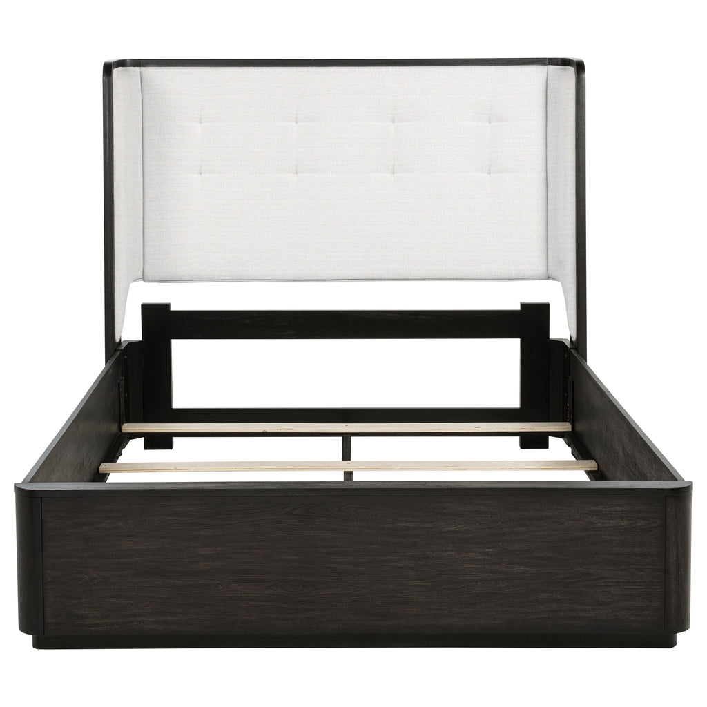 Embrace restful refinement with this wingback bed, where sculpted edges and tailored softness unite. The headboard’s clean winged silhouette is wrapped in cream fabric, offering contrast against the burnished black frame and subtle tufting for a gentle finish. Crafted from a blend of solid and engineered wood, this foundation-ready bed balances strength with serenity, blending modern minimalism with quiet luxury. Key Features: • Queen wingback bed with soft curves and burnished black frame for modern sculptural style • Cream upholstered headboard adds tailored softness with subtle tufting • Contrasting textures highlight the clean silhouette and restful form • Foundation-ready platform design accommodates standard mattress setups • Crafted from ash veneer, solid wood, engineered wood, and supportive plywood • Neutral palette and gentle proportions create a serene bedroom focal point