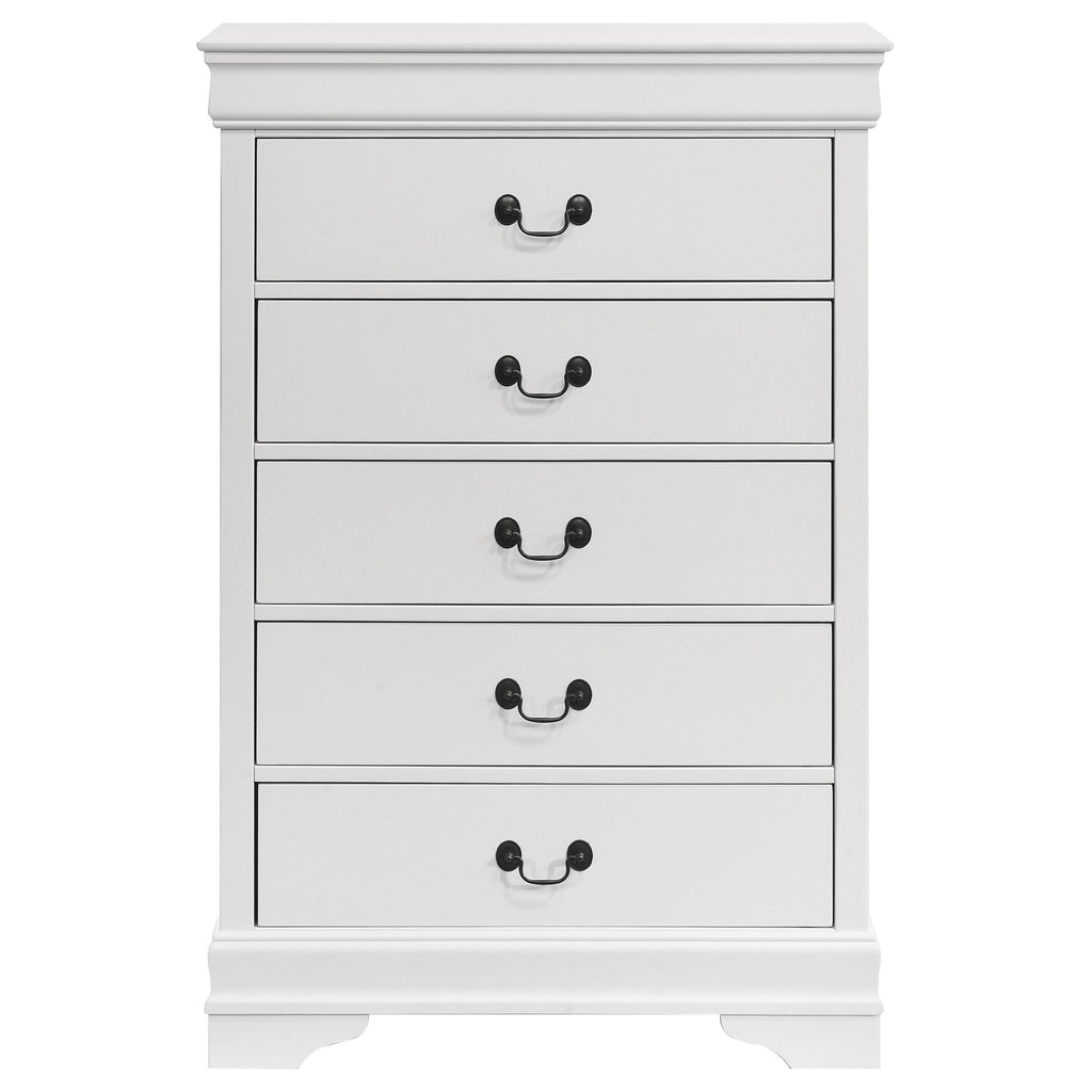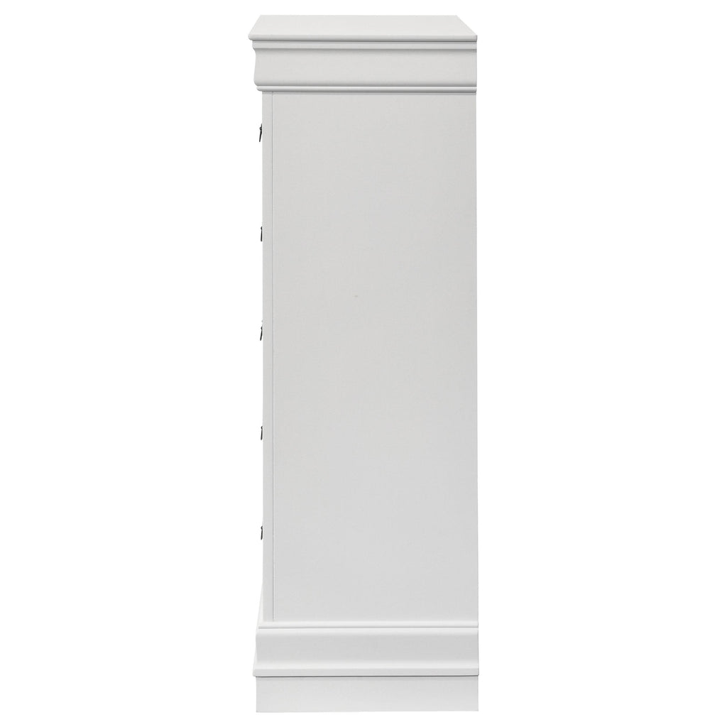 Add depth to a traditional decor scheme with this five-drawer chest. Simple and elongated, the silhouette features wood veneer and select hardwoods. Radiate classic style and sophistication with a warm cappuccino finish. Contrasting nickel bail drawer handles are a modern upgrade. The English dovetail construction provides structure that is perfect for storing linens and extra clothing. Key Features: • Five-drawer chest made from wood veneer and select hardwoods for a sturdy and durable storage solution • Features a warm cappuccino finish, adding a touch of classic style and sophistication to any room • Equipped with contrasting nickel bail drawer handles for a modern touch and easy access to stored items • Built with English dovetail construction, ensuring a robust structure for storing linens and extra clothing • Elongated silhouette design, perfect for adding depth to a traditional decor scheme