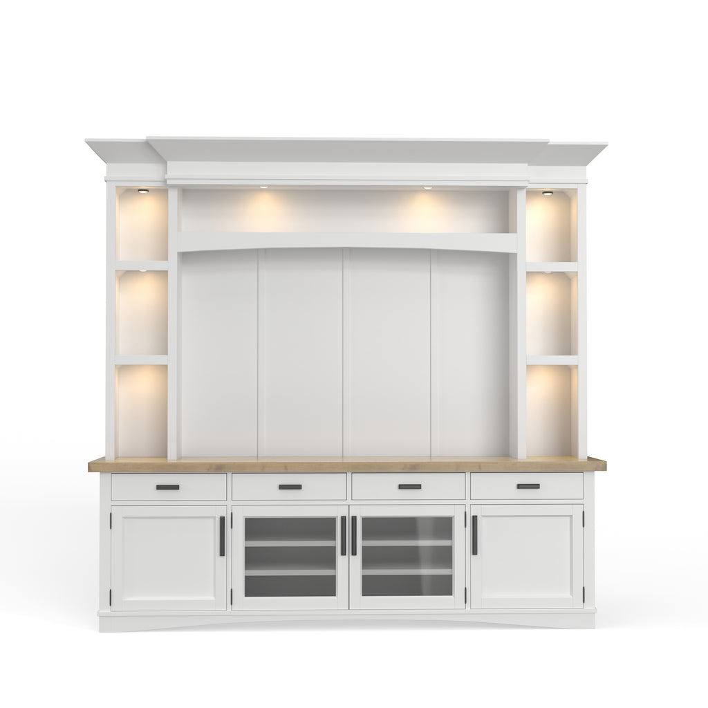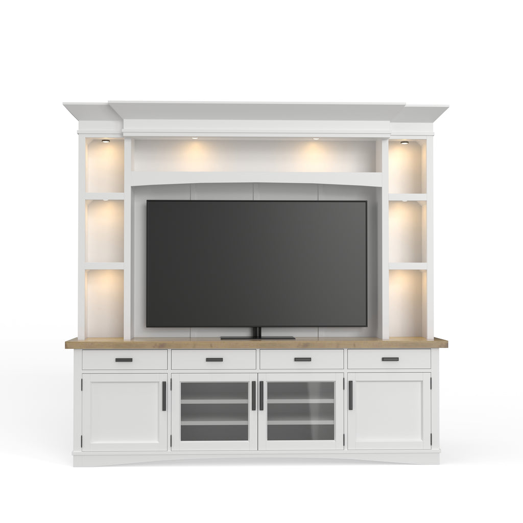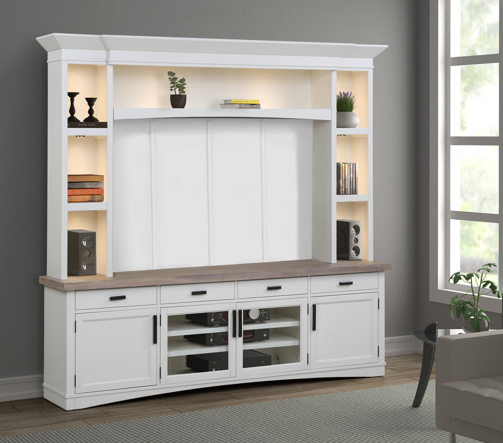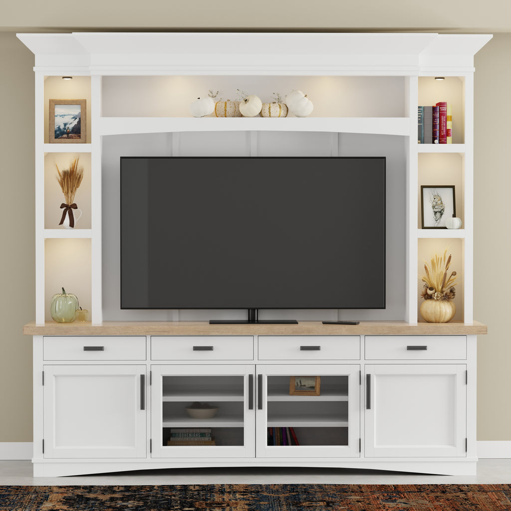 Surround your television and components in classic style with this 92-inch TV Console with Hutch and back panel. Simple yet elegant, its classic silhouette is finished in a soft, off-white shade of Cotton with a contrasting wood-grain top in Weathered Natural. Part of the Americana Modern collection, this multifunctional media solution features adjustable wood shelves, storage drawers and compartments, 3-way LED touch-lighting, glass doors with wood trim, and cord management.