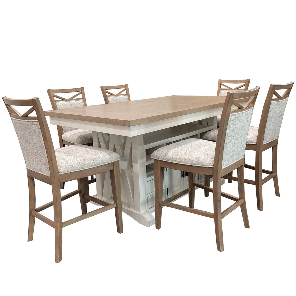 This seven piece dining set from our Americana Modern dining collection includes one counter height island table and six upholstered counter height bar chairs, exuding casual comfort in everyday dining.