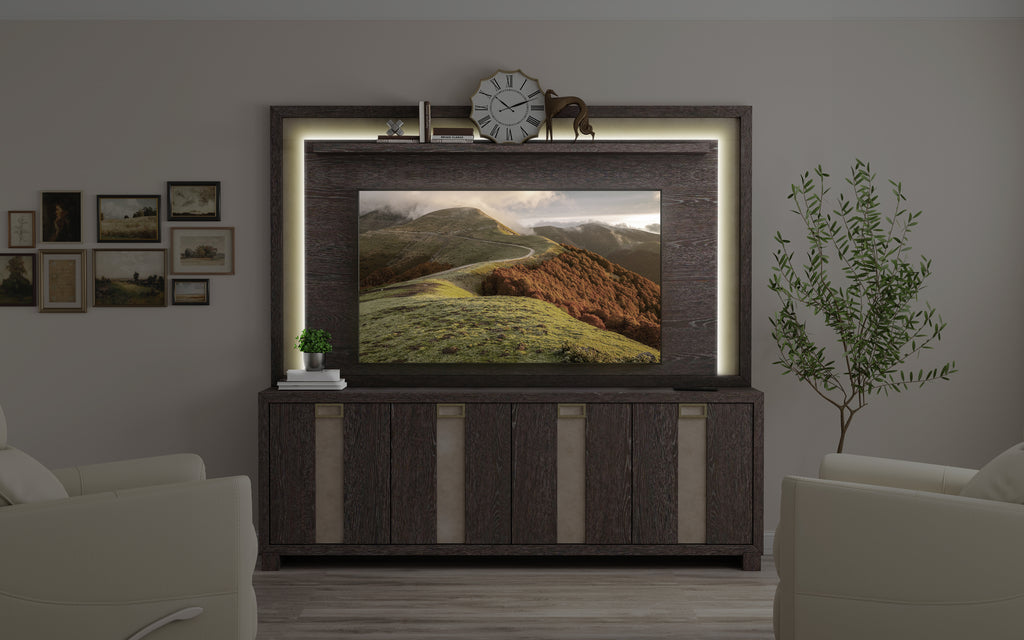 Brighten up your movie night with the Ascent Entertainment Wall. Mount a TV of up to 150lbs to the backpanel for cleaner vantage points for the whole family. Convenient interior console storage is complete with adjustable shelving and a hidden drawer. Light frames the interior of the shagreen texture on the backpanel, allowing the perfect amount of light for snuggling up with your favorite show.