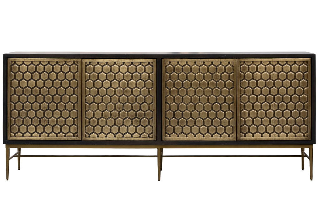 Relaxed meets refined in the chic character of the Cairo multifunctional console. Its distinctive door panels feature and eye-catching pattern of embossed hexagons accentuated in a bronze metal finish. Cairo adds and element of warmth to the room and is destined to be a topic of conversation.