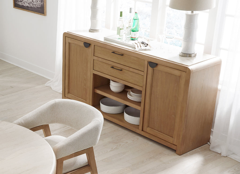 Easygoing. Inspired. Simplicity. with nature as its muse, the Escape whole home collection elevates the everyday with furnishings in harmony with modern living. Its unique designs draw upon a palette of nature-inspired materials, including authentic oak wood grains in a soft natural finish, genuine sandstone, woven cane, warm bronze metal, and slubby woven textiles. Simplified silhouettes and gentle curves create a visual that promotes comfort and relaxation. In harmony with all, Escape can be styled to fit any design aesthetic and makes every space feel like a retreat.