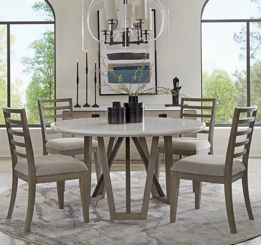 - Round 54" table with fashionable white quartz top featuring a chamfered edge and geometric base is a statement-maker