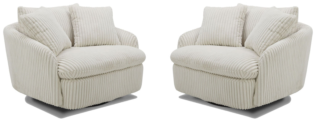 - Plush, generously sized swivel chair creates a cozy, welcoming spot in any room.