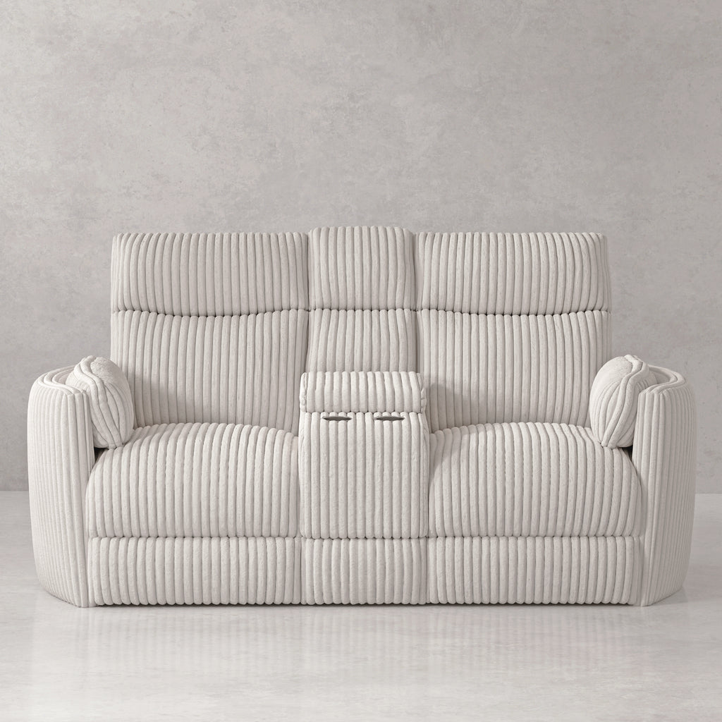 - Glider loveseat recliners with storage console, drink cup holders, and wireless charger