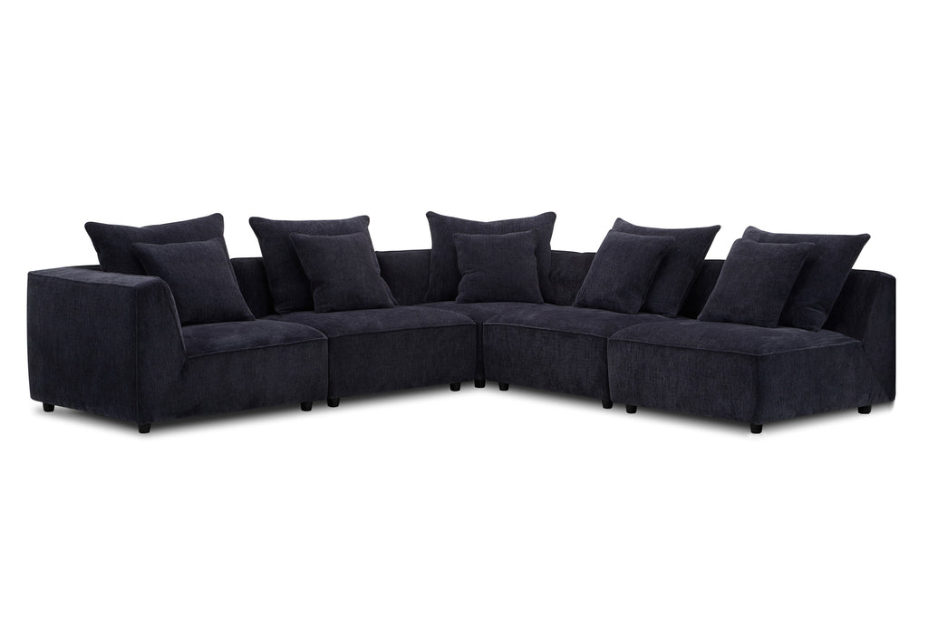 This exquisite sectional is tailored with precision and upholstered in a durable, 100-percent woven chenille fabric that boasts a velvety hand and and embossed pattern that adds and extra touch of sophistication.† This sectional is designed with your ultimate comfort in mind. The comfort cushion is encased in cotton, down-proof channeled ticking to help it keep its shape and prevent feather migration. The cushions are padded with high-density Dacron and topped with sterilized down and feathers for maximum plushness. The sectional is built to last, with wood frames that feature reinforced corner blocks for lasting strength and stability. Select woods are kiln-dried to minimize warping and splitting while ensuring longevity. This attention to detail ensures that your sectional will remain sturdy and reliable. Whether you're looking for a cozy corner for movie night or a space to entertain guests, our 5-piece modular sectional has you covered. with its modular design, you can arrange the pieces to fit your space and your needs.
