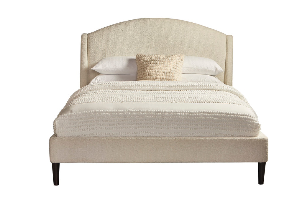A soft crescent-shaped curve gives this upholstered bed fresh design appeal. Its subtly sloping headboard adds updated character to any bedroom while fully upholstered rails and tapered legs complete the timeless look. Upholstered in a soft, textural bouclÈ fabric.