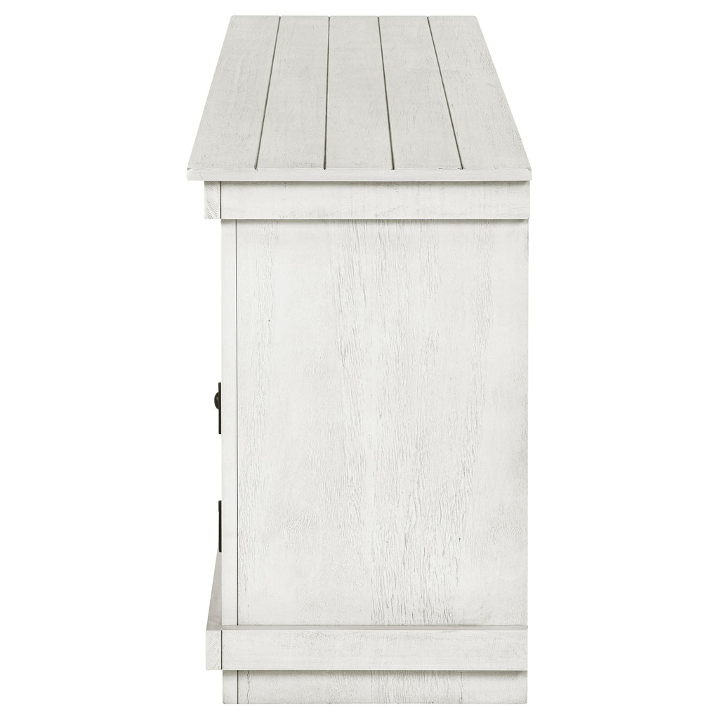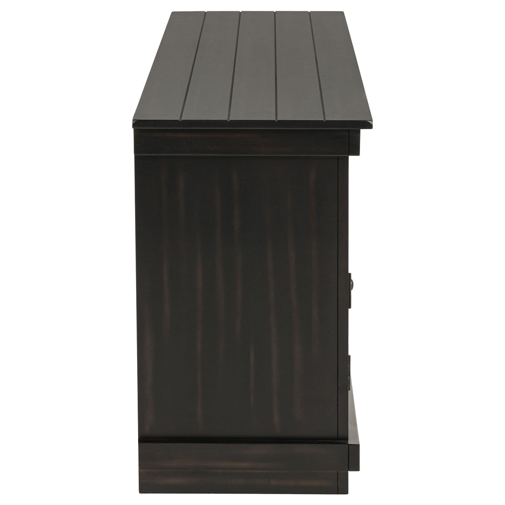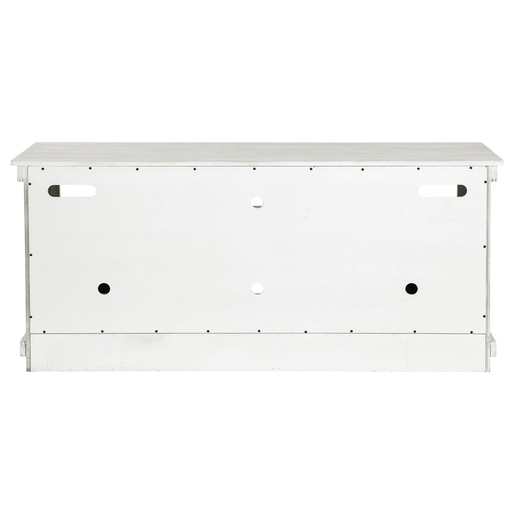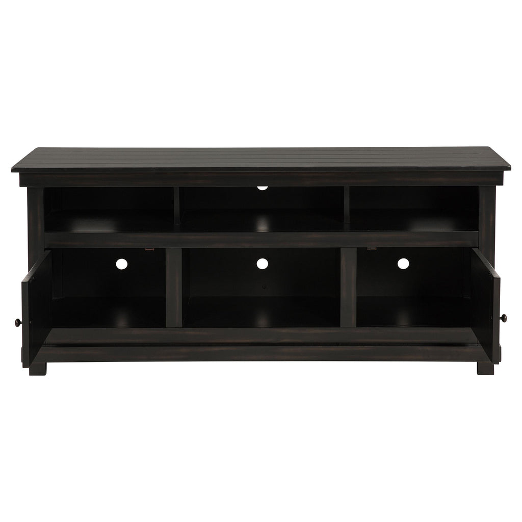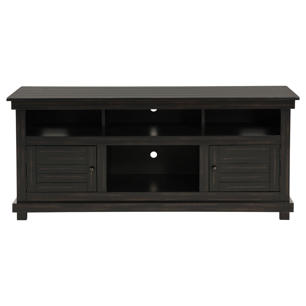 Complete a media center in your inviting home with a modern farmhouse TV stand. It's an approachable design with roughhewn wood details that create texture and dimensionality in your living space. Two shelves and six compartments create ample storage, perfect for everything from peripherals and accessories to personal decor. The media console features a clean-lined silhouette with a slim profile, perfect for a flat panel or wall-mounted television. This TV stand accommodates televisions up to 65 inches. Key Features: • Roughhewn wood markings add artisan character to a modern farmhouse TV stand • A distressed finish lends casual farmhouse character in your den or living room • Two open shelves provide space for media and gaming peripherals and decor • Six compartments storage that's perfect for accessories and media like games and controllers • A slim, straight-lined silhouette supports a flat panel television up to 65 inches