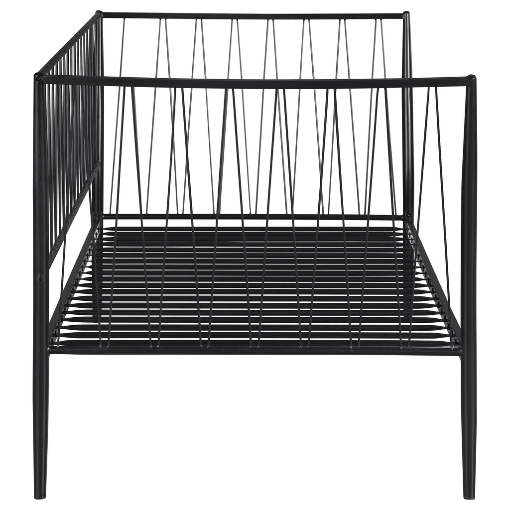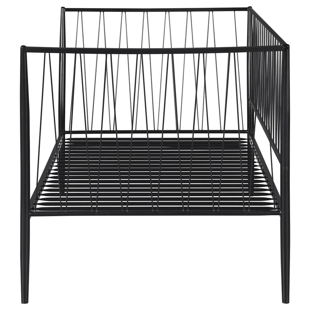 This transitional-style metal daybed combines sleek aesthetics with durable functionality, making it ideal for guest rooms or compact spaces. The design features slim, vertical metal slats with an angled backrest for a subtle modern flair. Welded metal construction ensures strength and stability, while the powder-coated matte black finish resists wear and adds sophistication. The integrated metal slatted platform provides dependable mattress support without requiring a box spring, emphasizing its minimalist appeal. Key Features: • Transitional-style daybed with angled backrest and slim, vertical slats for added visual interest • Welded metal construction provides sturdy support and reliable durability • Matte black powder-coated finish offers modern sophistication and long-lasting wear resistance • Slatted metal platform eliminates the need for a box spring, ensuring mattress ventilation • Ideal for small spaces with its sleek profile and multifunctional design • Balances minimalist aesthetics with practical, space-saving functionality