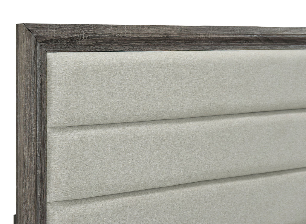 Introduce refined style in an approachable bedroom ensemble with this transitional wooden bed. With an upholstered headboard, it delivers impeccable comfort for lounging and relaxation. A brown oak wood grain finish pairs with laminate, delivering the perfect blend of style and durability. Tan fabric pairs with foam cushioning, delivering a complementary color tone that remains neutral in your bedroom. The bed features a tall headboard paired with a low footboard, creating an open, airy profile.